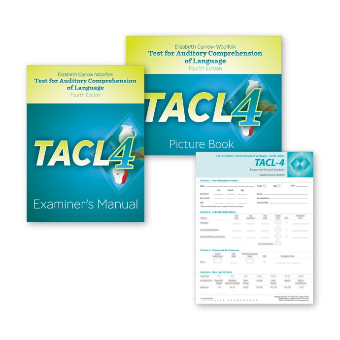 Complete TACL-4 Kit Includes: Examiner's Manual, Picture Book, 25 Examiner Record Booklets, Critical Reviews and Research Findings for TACL: 1965–2013, and TACL-4/TEXL Comprehensive Scoring Supplement, all in a sturdy storage box. (©2014)