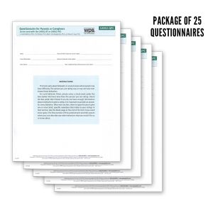 The parent or caregiver of the individual being assessed completes this unscored form. Its primary purpose is to give the clinician more information on which to base the CARS2-ST or CARS2-HF ratings. The questionnaire covers an individuals early development; social, emotional, and communication skills; repetitive behaviors; play and routines; and unusual sensory interests.