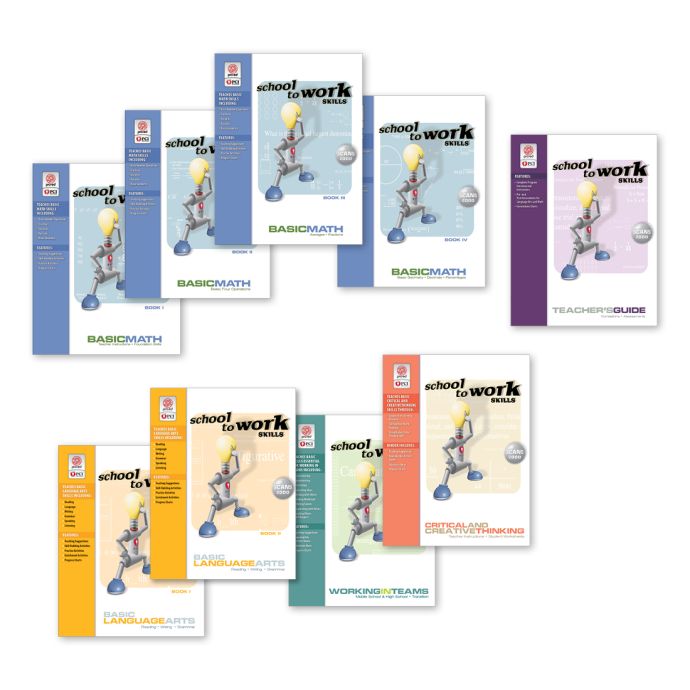 The School-to-Work Skills series is a comprehensive program that focuses on skills correlated with the Department of Labor SCANS 2000 guidelines, which detail the necessary skills students must master in order to be prepared for entering the work force. The Complete Program consists of eight reproducible books that cover basic language arts, basic math, working in teams, and critical and creative thinking. The included Teacher's Guide correlates the entire program. All components are also available separately.